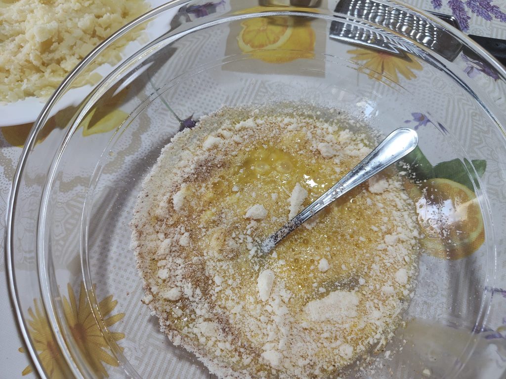 Voeg de geraspte Parmezaanse kaas toe, een snufje zout en peper.