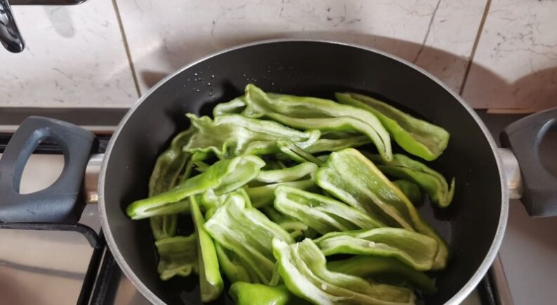 Haal de paprika’s eruit als ze na een paar minuten zacht en licht gekleurd zijn.