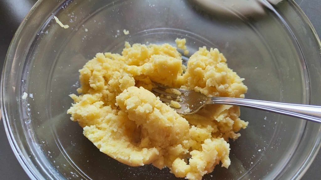 Klop in een aparte kom de eidooiers met peper en zout, voeg ze vervolgens toe aan de aardappelpuree, breng op smaak met geraspte nootmuskaat en voeg de geraspte kaas toe, meng met een lepel om de ingrediënten te combineren tot een zachte en droge massa.