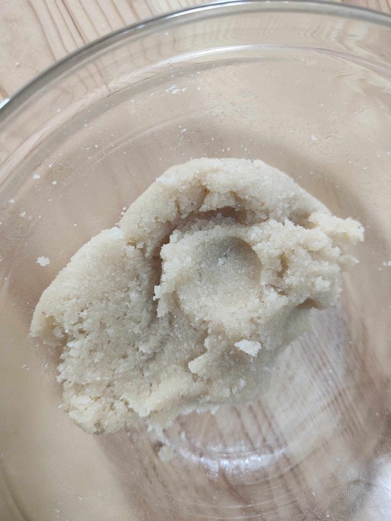 • Als je een steviger deeg hebt gekregen, ga dan naar het werkblad en werk nog een minuut. Dit deeg moet namelijk niet te lang worden bewerkt, anders zou de amandel te veel olie loslaten.