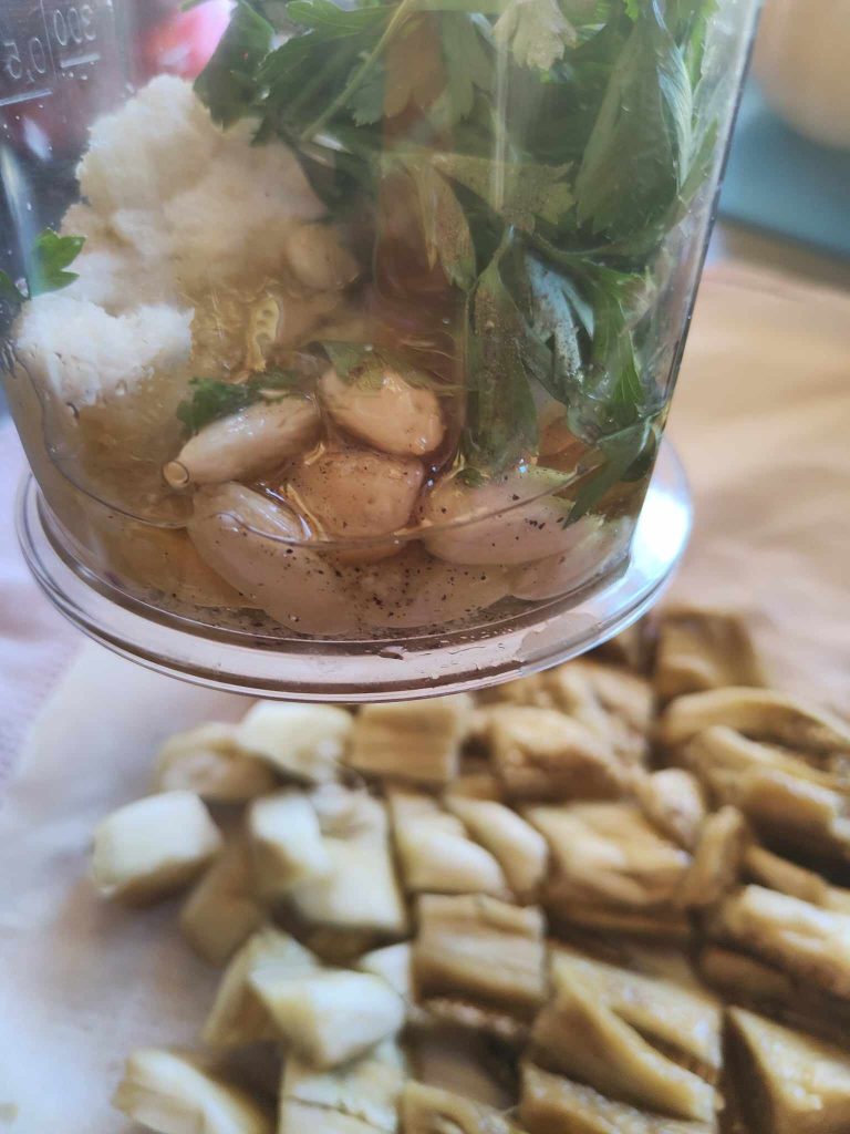 • Na deze tijd de aubergines uit de oven halen en 10/15 minuten laten afkoelen voordat je verder gaat met de bereiding van de pesto.