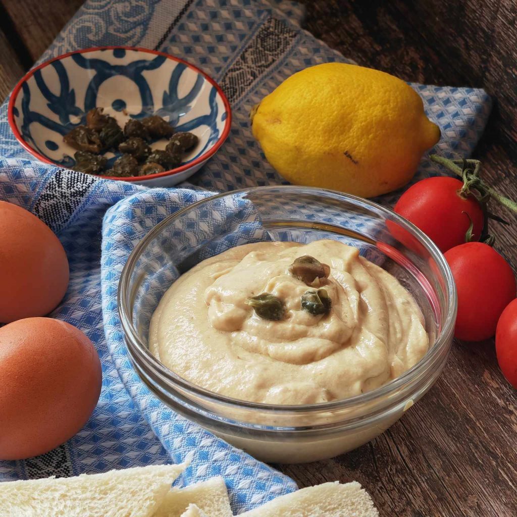 Doe in een mixer de goed uitgelekte tonijn, de hardgekookte eieren, 2/3 in stukjes gesneden ansjovisfilets, 1 theelepel kappertjes, de extra vergine olijfolie en het citroensap.