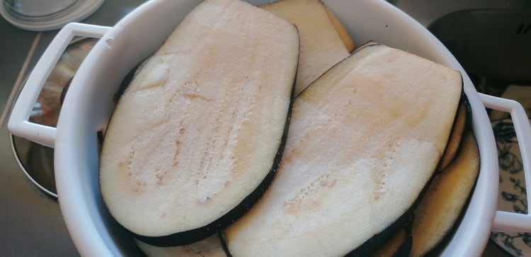 Om de aubergines in water en zout te zouten, moet je de aubergines in plakjes snijden.