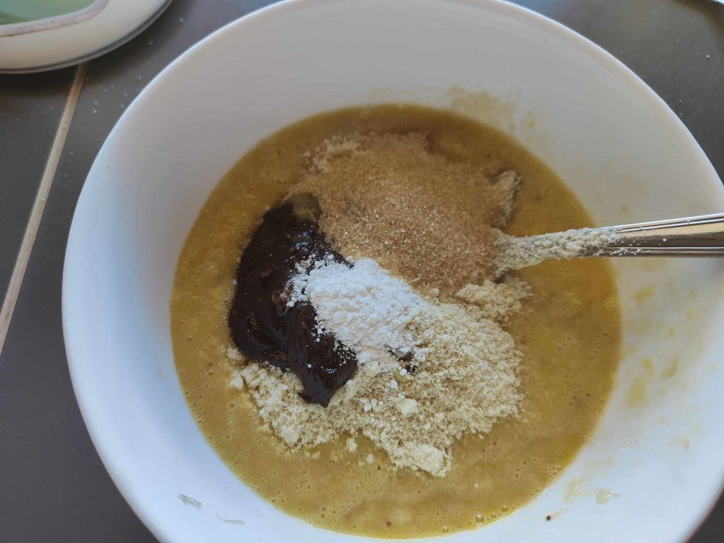 Voeg het amandelmeel, een snufje bicarbonaat en gesmolten pure chocolade toe.