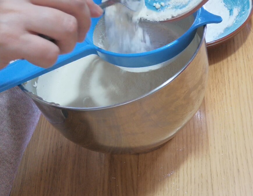 Voeg voorzichtig de bloem en het aardappelzetmeel toe, samen met een snufje eerder gezeefd bakpoeder.