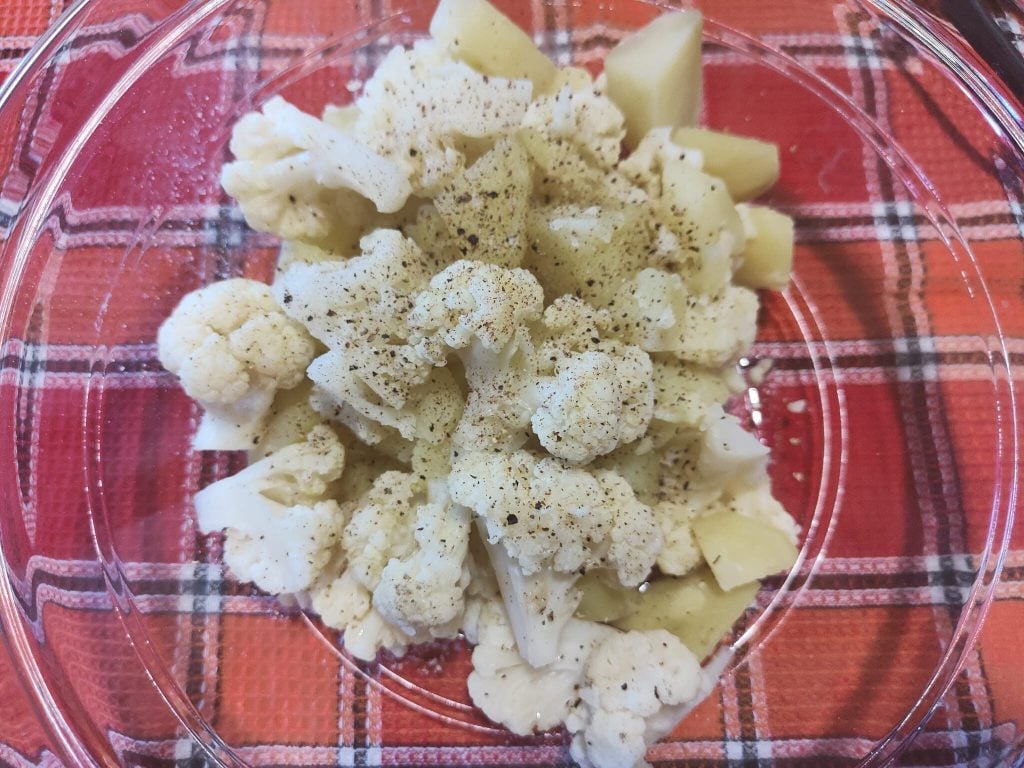 (Advies voor koken in airfryer, houd deze parameters aan: maximaal 2/3 cm hoog, de kooktijd bedraagt 20/25 minuten in de voorverwarmde airfryer op 190 graden. Als je mand breed is, kun je ook meer bloemkool en aardappelen gebruiken, met nog steeds een kwartier kooktijd, belangrijk is om deze hoogte aan te houden).