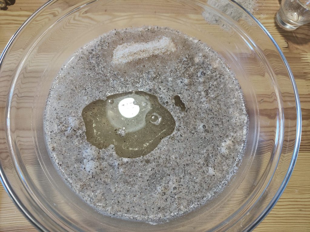 In een kom doen we het boekweitmeel, daarna voegen we de droge gist toe en vervolgens ook 20 g PSYLLIUM.