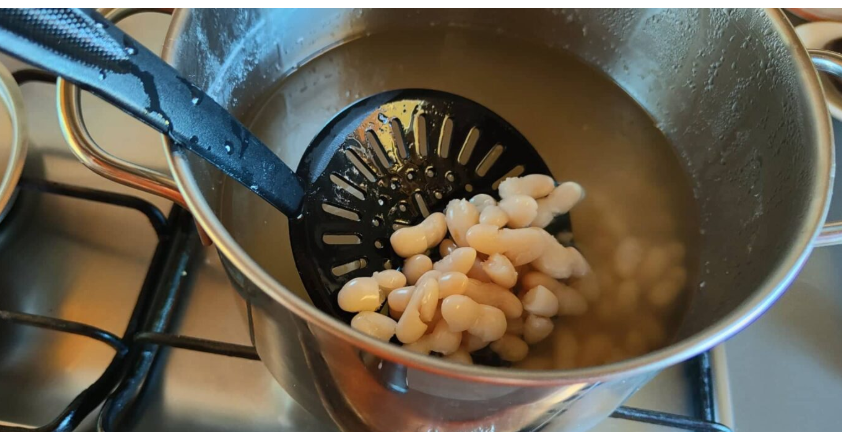 Om bonen en andijvie te bereiden, begin je met het weken van de droge cannellini bonen gedurende 12 uur in ruim water, het is belangrijk dat het waterniveau ruim boven de bonen is en niet op hetzelfde niveau.