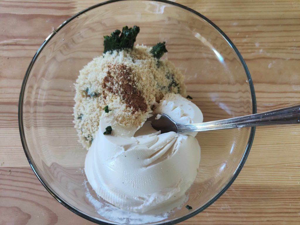 Meng in een kom de ricotta met de spinazie en de geraspte kaas.