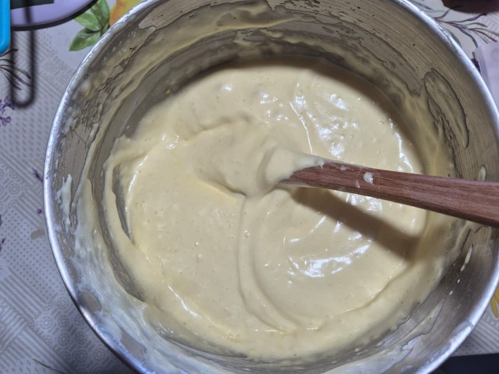 Incorporeer de gezeefde bloem, gietend in 2-3 delen en meng voorzichtig met een spatel, van beneden naar boven, om het mengsel niet te ontleden.Giet tenslotte het mengsel in een vorm, strijk het voorzichtig glad zonder druk uit te oefenen.