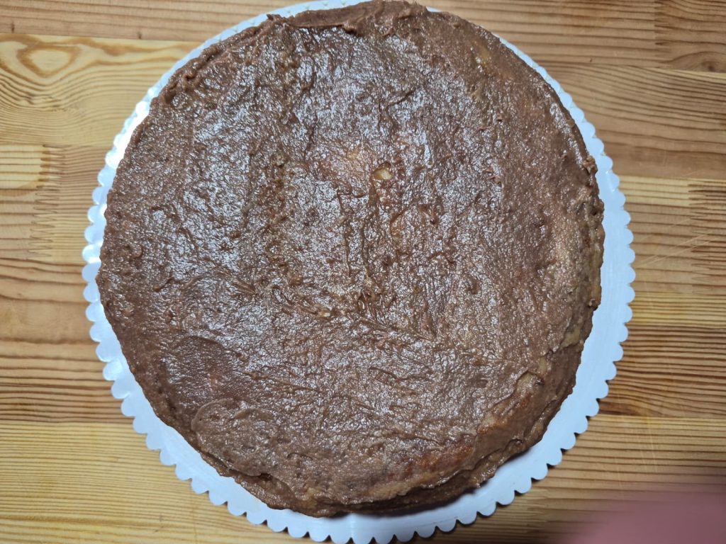 Tweede laag: Leg de tweede schijf, bevochtig het en smeer een deel van de cacaocrème (bewaar ongeveer een derde voor de buitenkant).
