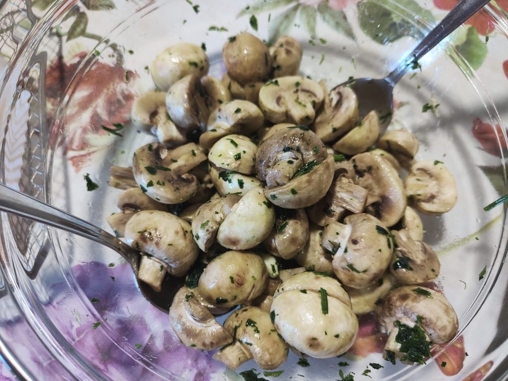 Net als gebakken champignons in de pan, hoeft u de champignons alleen maar op smaak te brengen met olie, knoflook en peterselie en ze te koken in de heteluchtfriteuse.