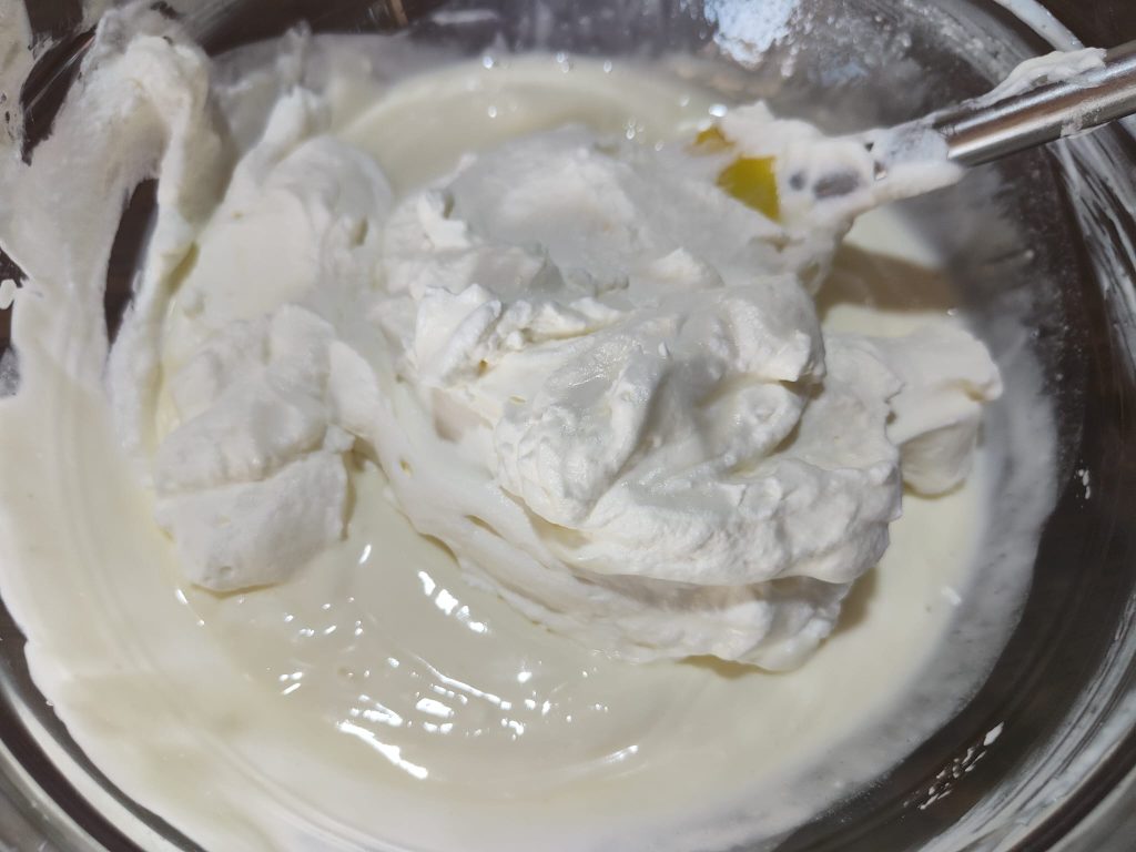 Meng in een andere kom met een elektrische garde de citroenyoghurt, de smeerbare kaas en de suiker.