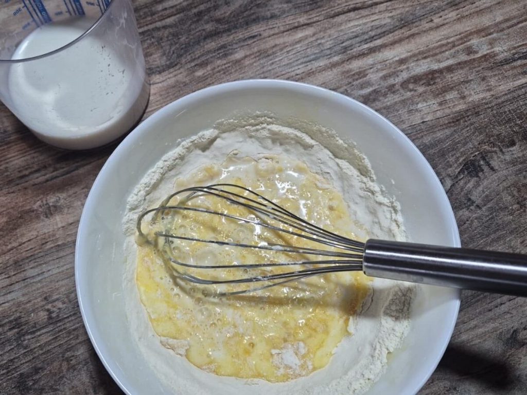 Voeg langzaam de bloem en melk toe en meng met de handgarde.