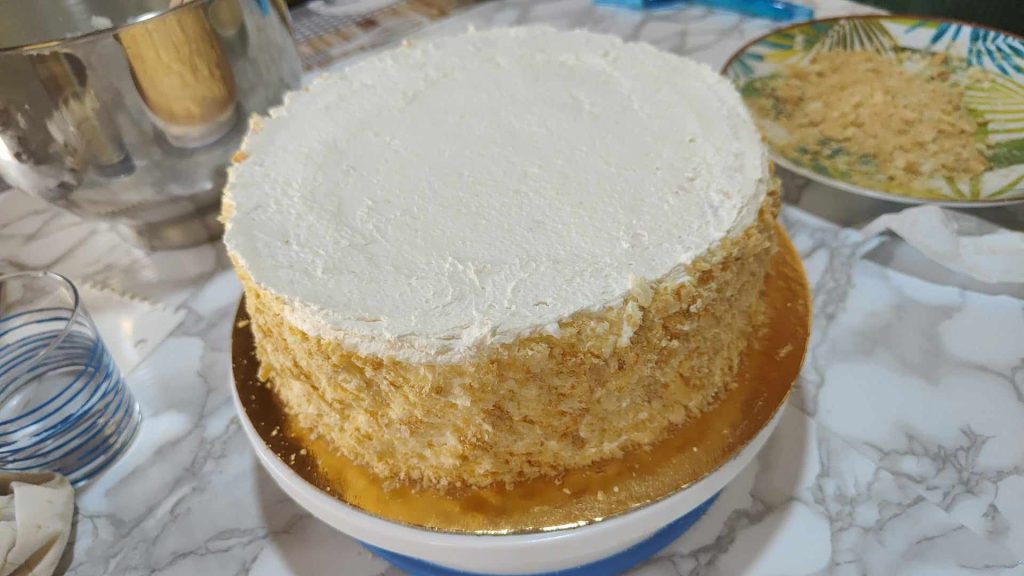 Begin met de eerste laag bladerdeeg en koude banketbakkersroom, daarna een schijf biscuit die lichtjes wordt ingesmeerd met siroop en vervolgens gevuld met een laag banketbakkersroom.