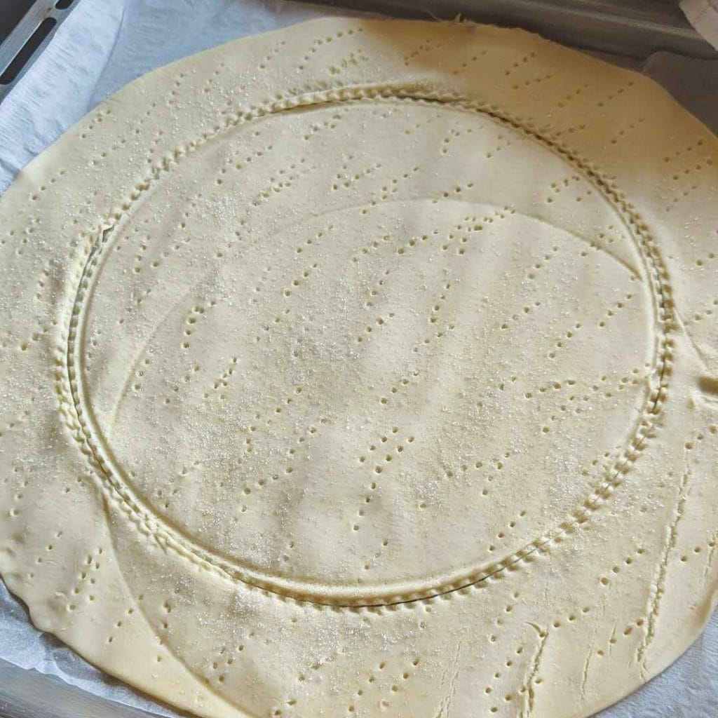 Snijd uit de rollen bladerdeeg (3 schijven van ongeveer 26 cm in diameter) en leg ze op 3 bakplaten, houd het papier eronder; bestrooi ze met suiker en prik ze met een vork.