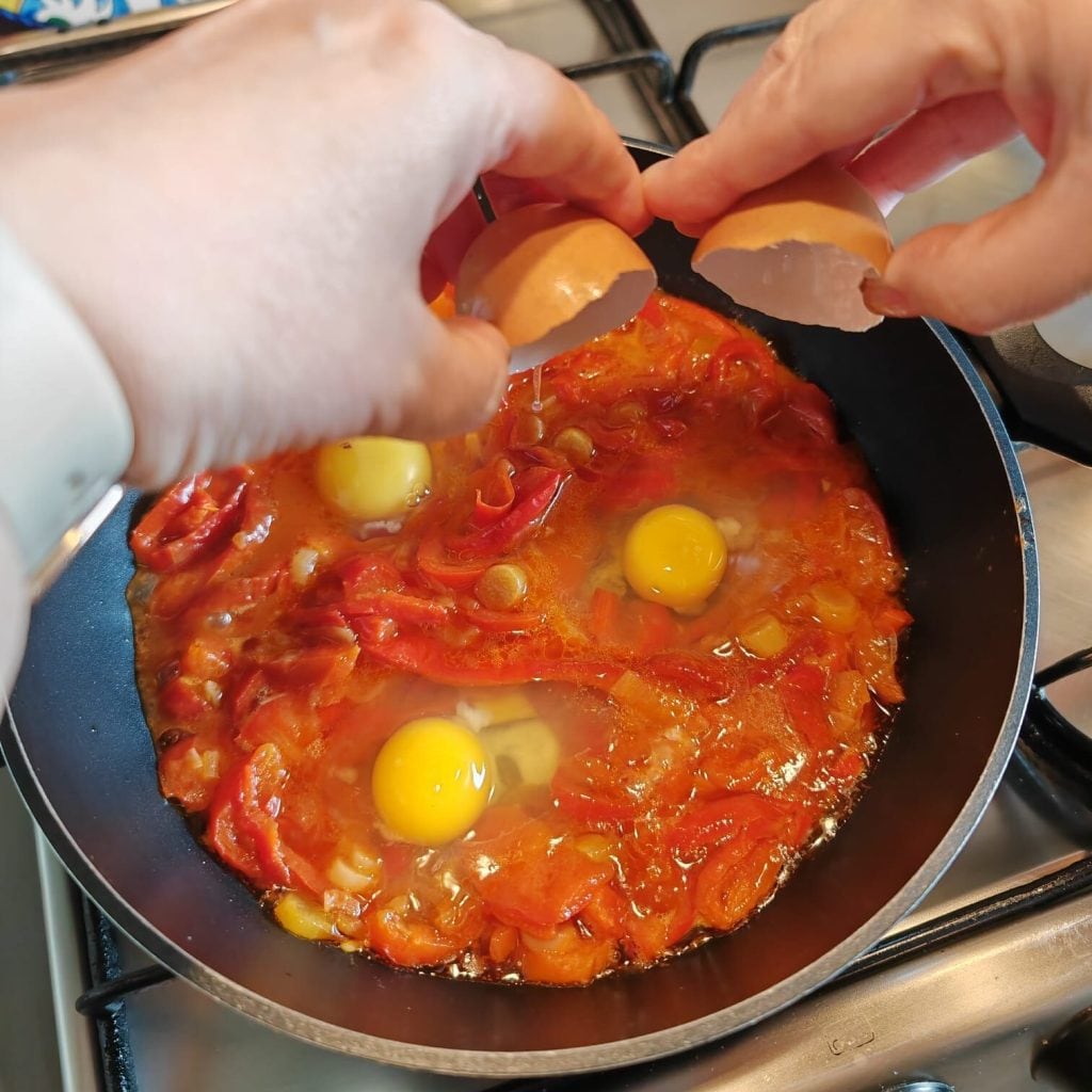 Het is een vrij eenvoudig gerecht: een pan vol saus met eieren, net gepeld en een paar minuten gekookt, net genoeg om het eiwit te laten stollen maar zonder de dooier te veel te koken, anders gaat de magie verloren.