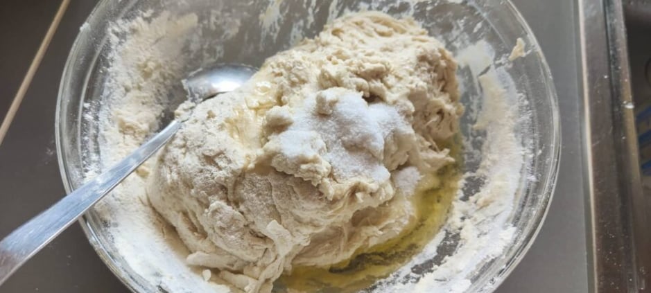 • Voeg de olie en het zout toe en als je wilt een lepel suiker, wat het rijzen zal vergemakkelijken.