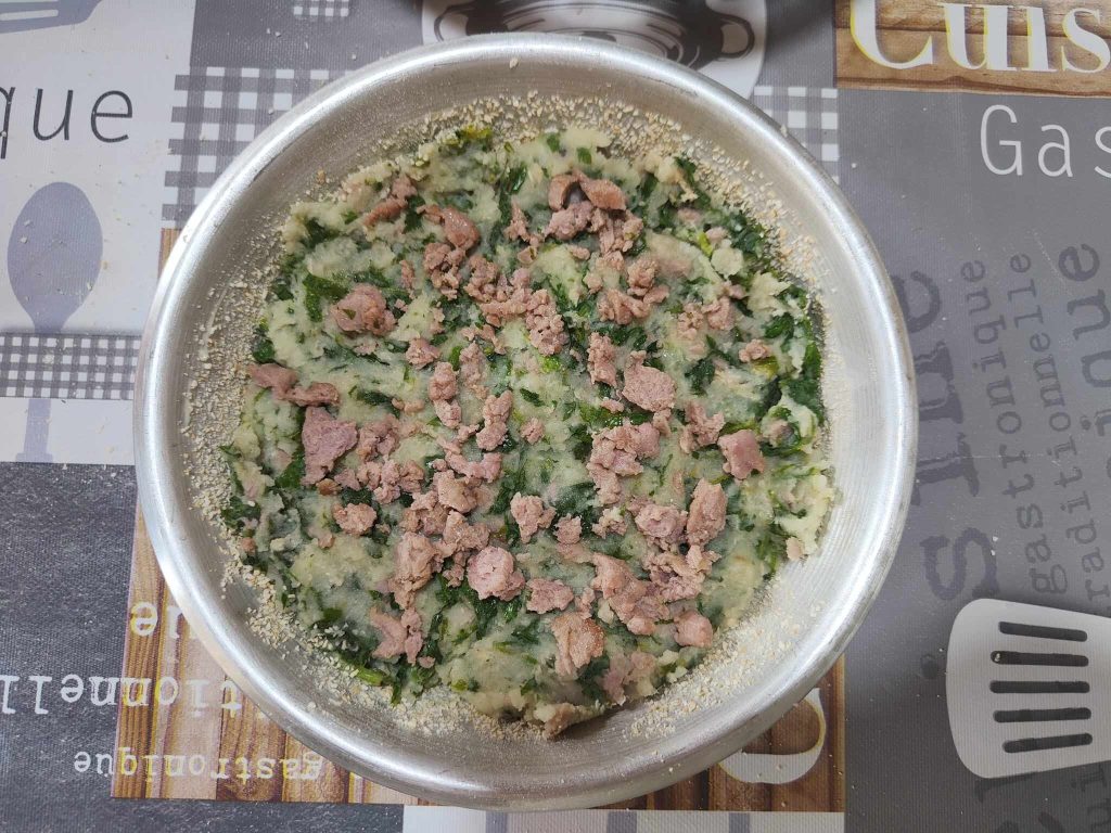 Voeg in een kom met de gestampte aardappelen de in kleine stukjes gesneden worstjes, de fijngehakte friarielli, de in plakjes gesneden provola, de geraspte kaas en tot slot de eieren toe.
