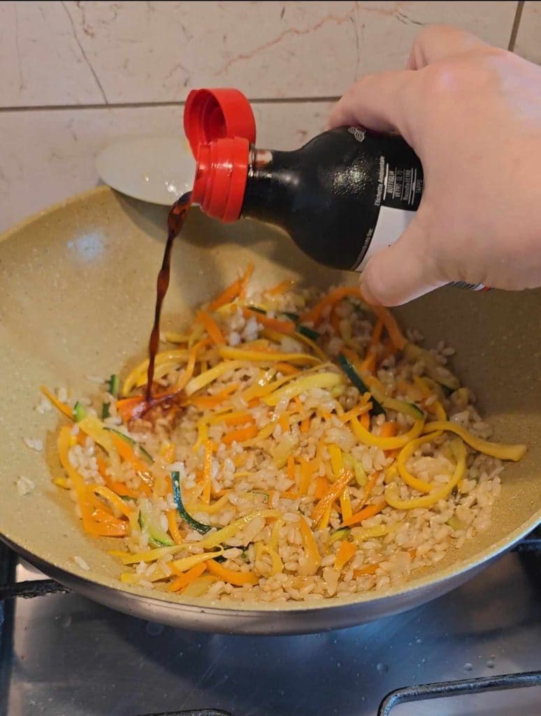 Gebakken rijst met groenten, sojasaus en garnalen. Het is een gemakkelijke en snelle manier om zelfs op het laatste moment een lunch of diner te bereiden.