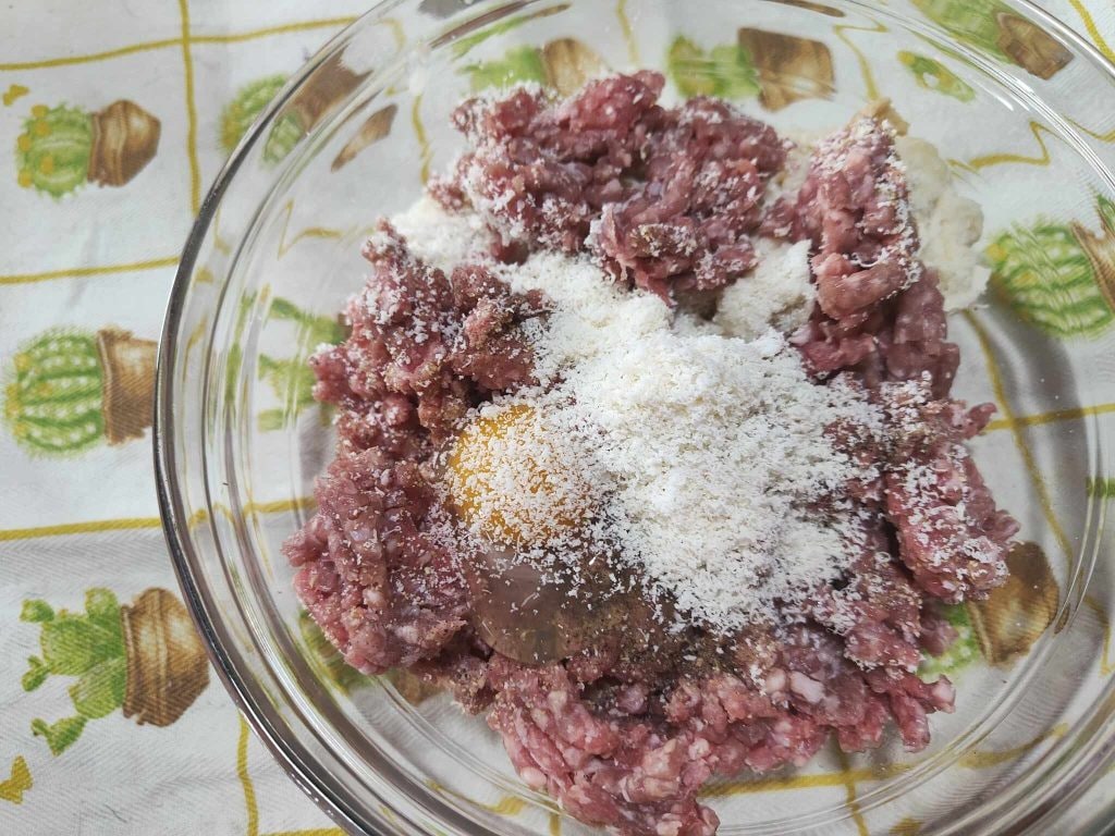 Voeg het uitgeknepen brood, het ei, de geraspte kaas en het zout toe.