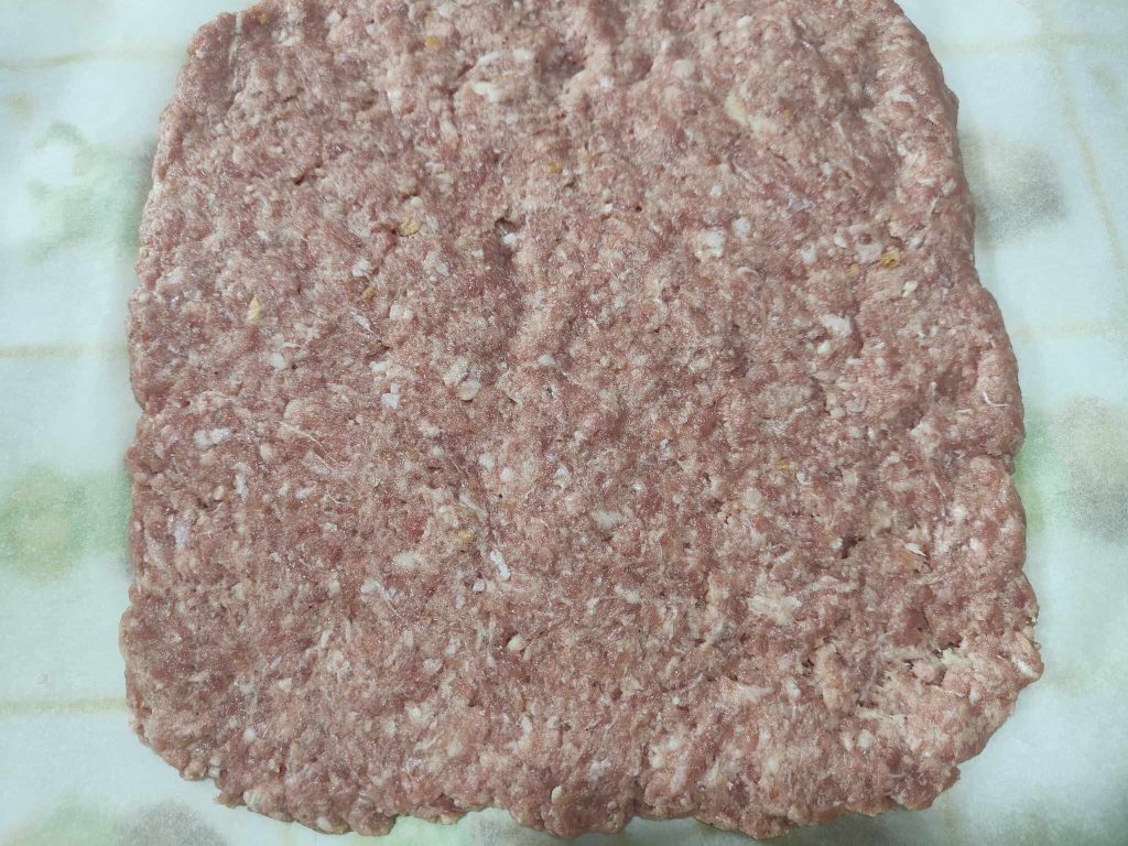 Vet het in met een eetlepel olie en leg het vleesmengsel erop, druk het een beetje plat.
