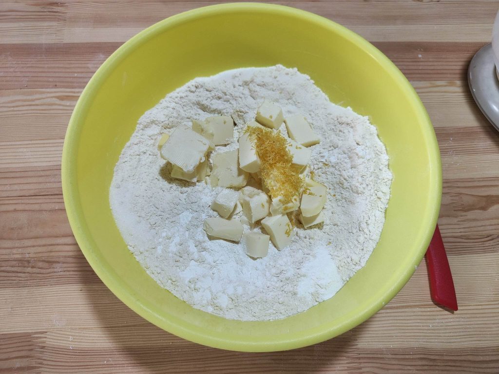 Begin allereerst met het zanderig maken: giet in een kom de gezeefde bloem, de suiker, het halve zakje gist en een snufje zout en de koude boter uit de koelkast, in grove blokjes gesneden, en de geraspte schil van een citroen.
