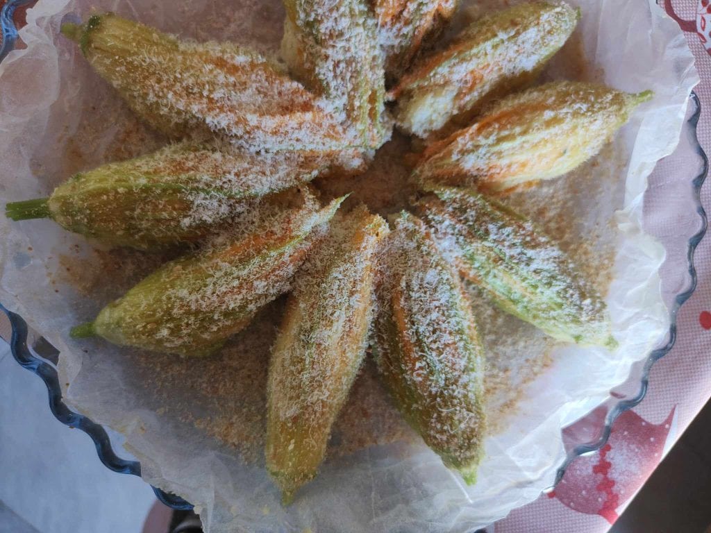 De delicatesse van de courgettebloem wordt knapperig gemaakt door een paneerlaag van paneermeel en geraspte kaas en wordt gebruikt als schuilplaats voor smaakvolle rijst gearomatiseerd met saffraan, en met gerookte provolone.