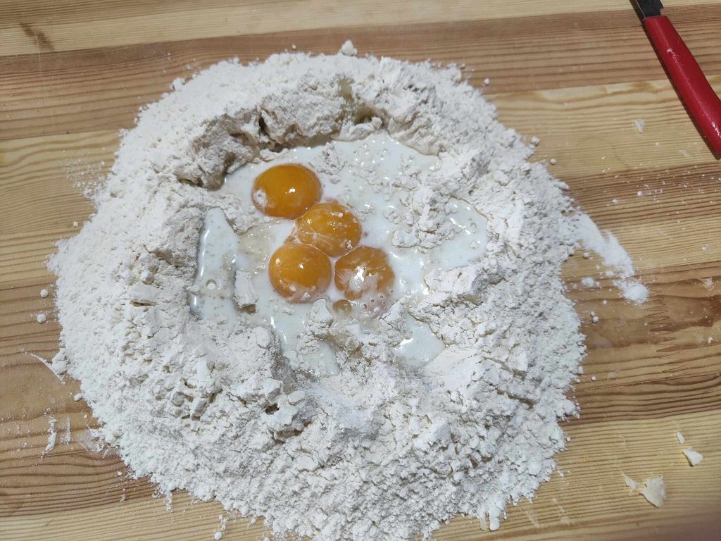 (Je kunt ook de klassieke fontein maken met de bloem op een schoon werkblad en de ingrediënten in het midden leggen en het mengsel kneden).