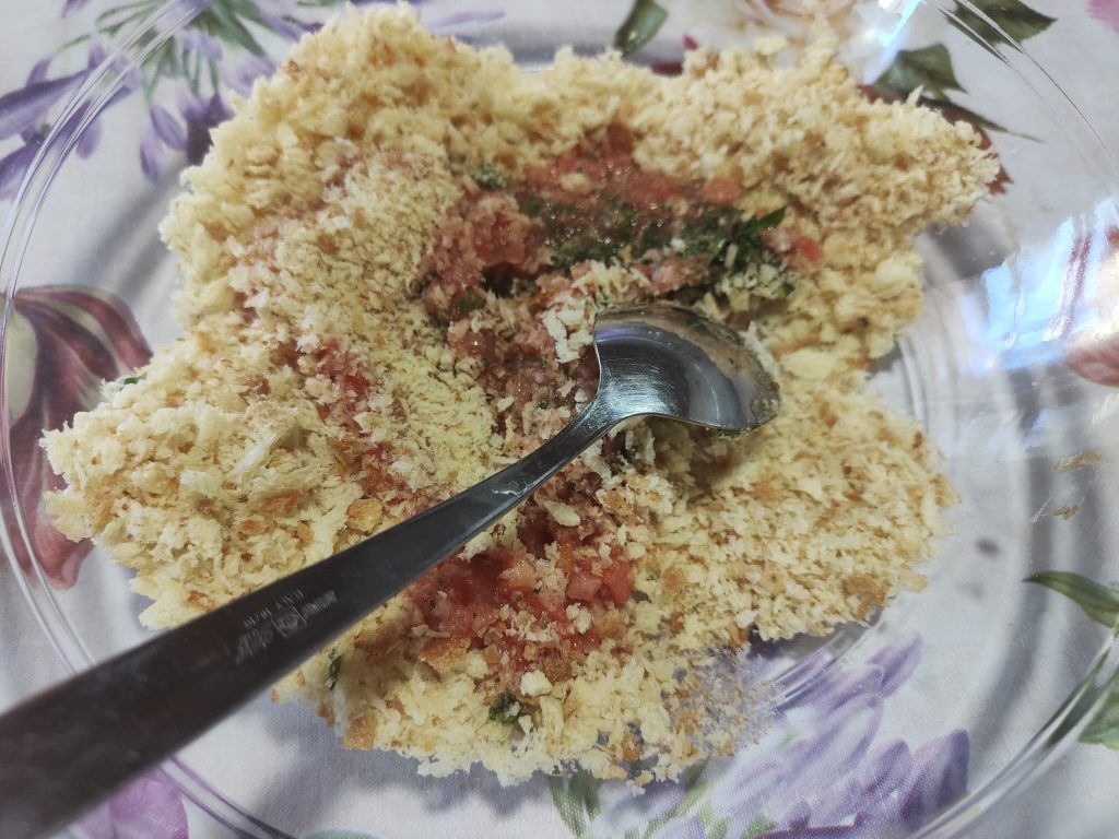 Bereid intussen de vulling: maal in de mixer het oude brood samen met verse kruiden, de knoflook, Parmigiano, Pecorino, ansjovis, kappertjes, chilipeper en twee eetlepels extra vergine olijfolie.