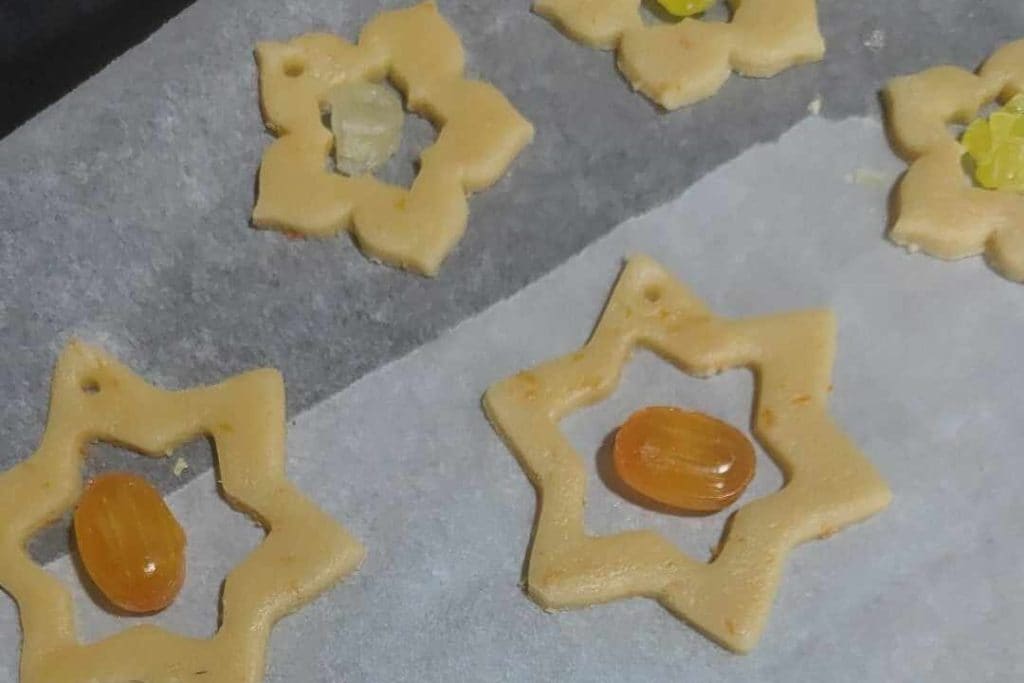 Tip (als je ze intern wilt decoreren, plaats dan de decoraties in het koekje zodra ze uit de oven komen, wees voorzichtig omdat het snoepje heet is, op deze manier blijven ze goed plakken).