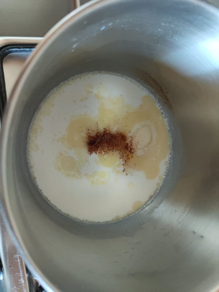 Giet de melk, 40 g boter in een pan, breng aan de kook en voeg een snufje zout en de nootmuskaat toe.