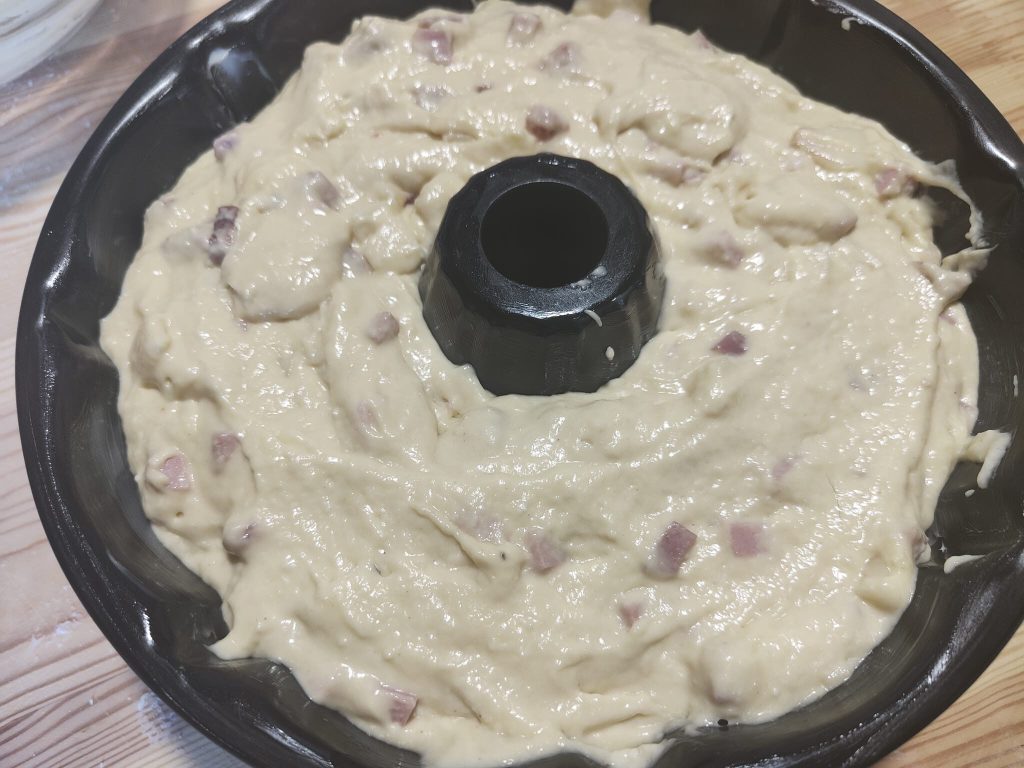 Wanneer je een homogeen deeg hebt verkregen, voeg je de kazen en vleeswaren toe