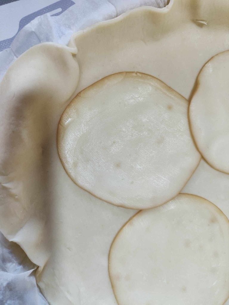 Rol het bladerdeeg uit en leg het met bakpapier in een bakvorm.