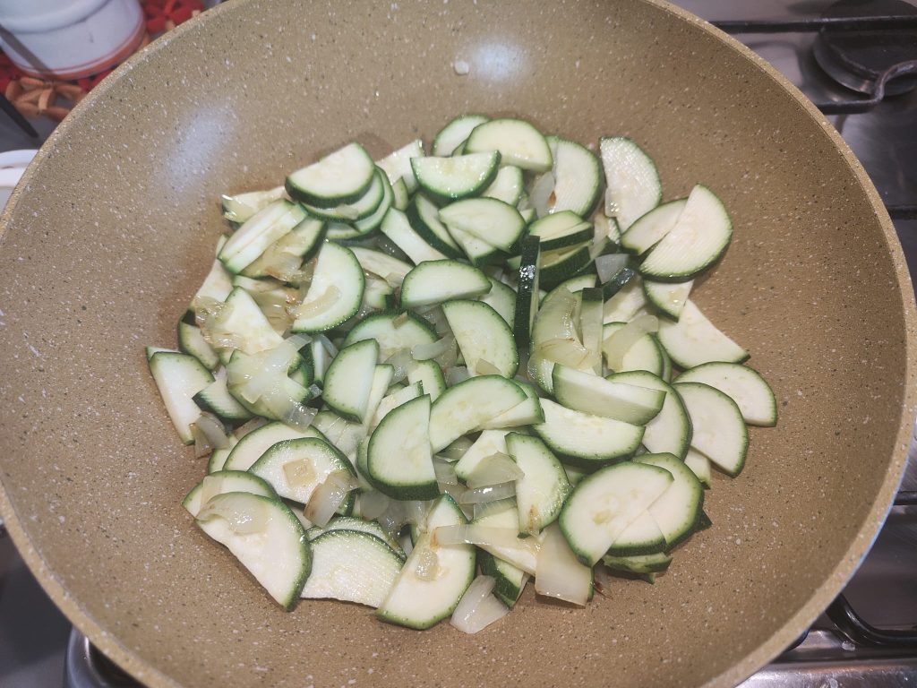 • Snijd de courgettes in plakjes, de ui fijn en bak ze beide in een koekenpan met een scheutje extra vergine olijfolie.