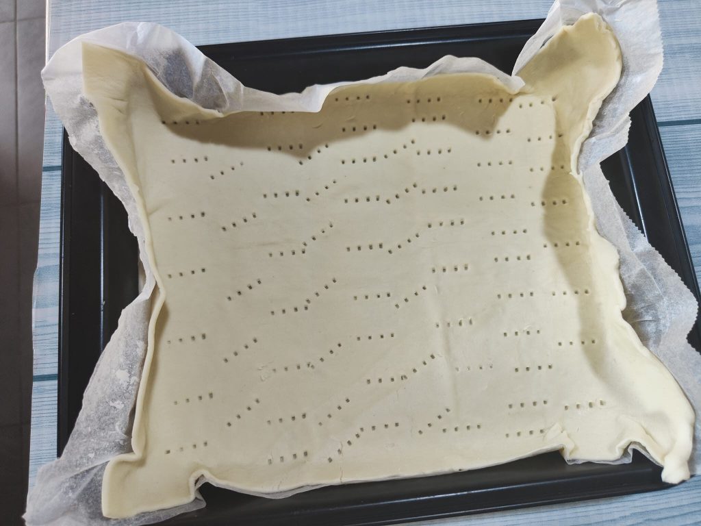 • Rol een vel bladerdeeg uit en leg het met het bakpapier in een vorm van ongeveer 30 x 20 cm en prik de bodem in met een vork.