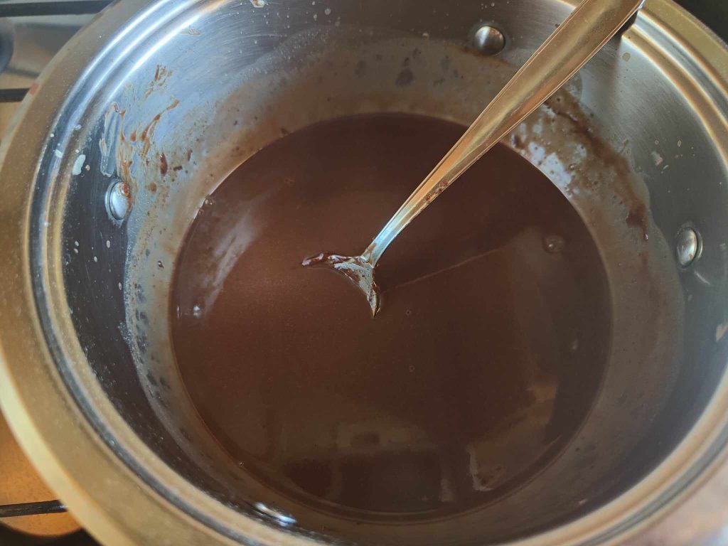 Voeg de Nutella en de pure chocolade toe en roer goed.