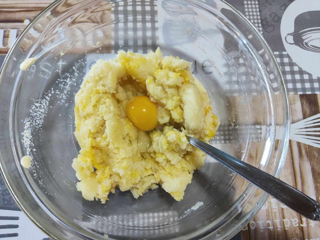 Verzamel de aardappelpuree in een kom en maak een kuiltje in het midden.
