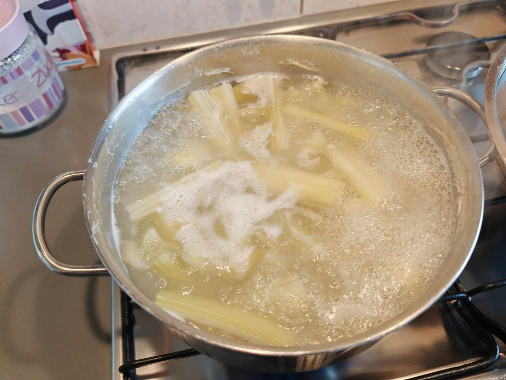 De kardoen moet een uur koken in water met citroensap en bloem, zodat de ribben hun witte kleur behouden.