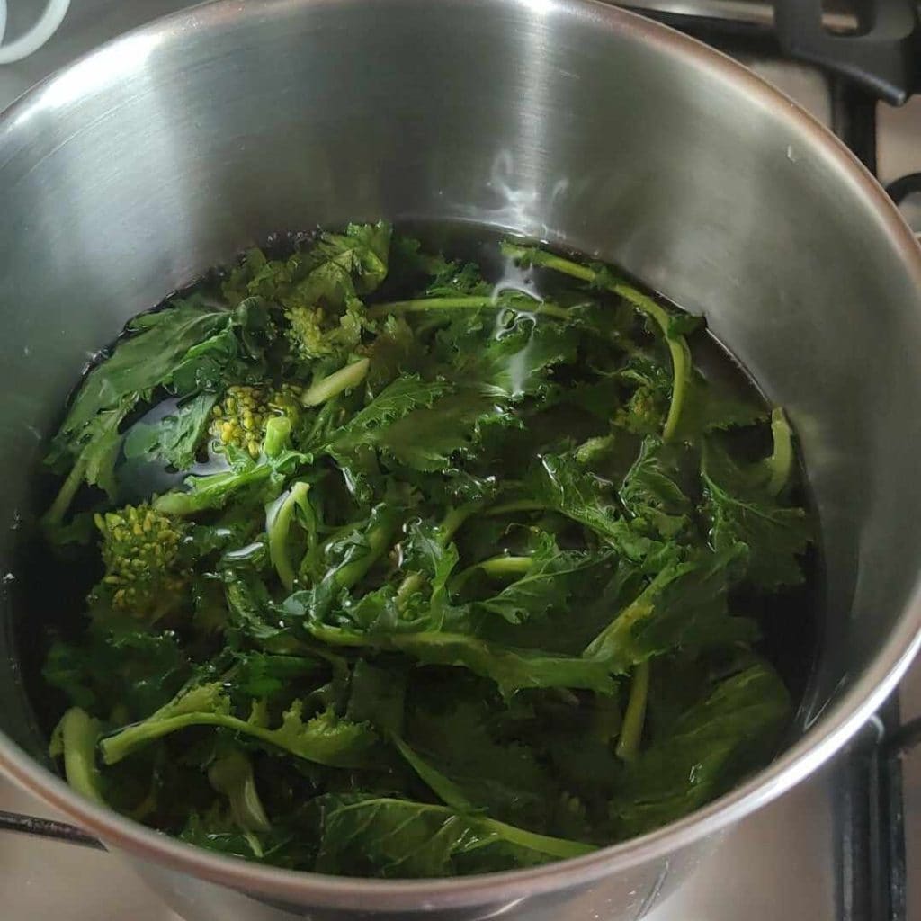 Zet een pan met voldoende water op het vuur en als het water kookt, zout en voeg de raapstelen toe en kook ze gaar.