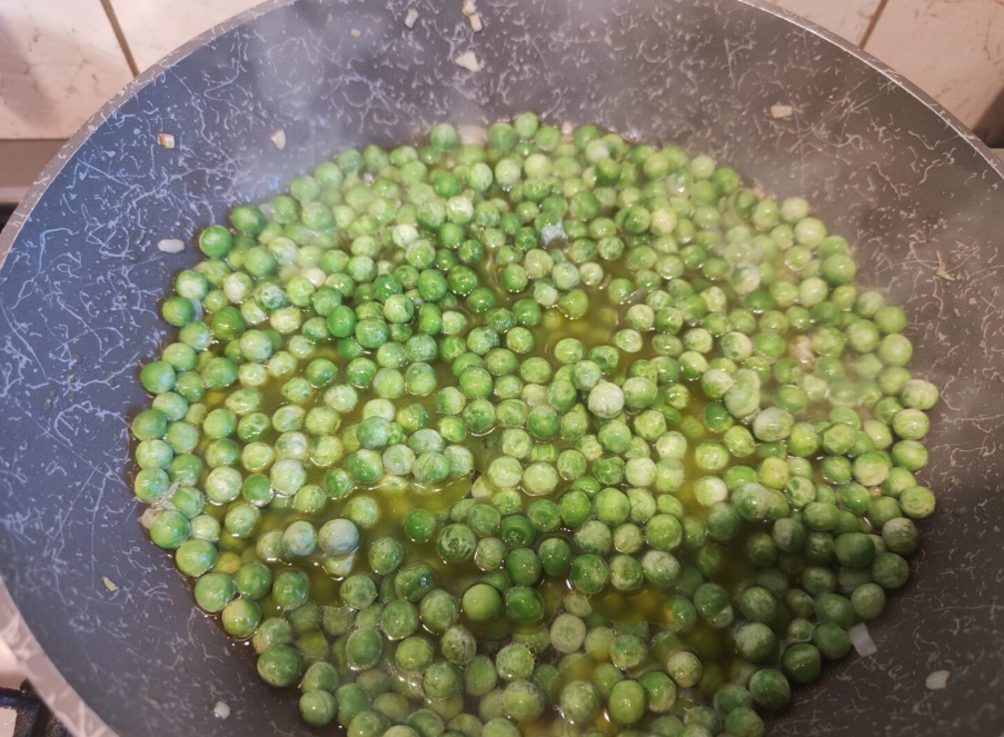 Als je heel kleine erwten (zoals fijne soort) gebruikt, voeg ze dan halverwege de gaartijd toe, ongeveer 15-20 minuten voor het einde. Omdat ze zeer zacht zijn, garen ze snel: zo behouden ze een heldergroene kleur en barst de schil niet, zodat ze er mooi intact bij blijven naast de venkel.