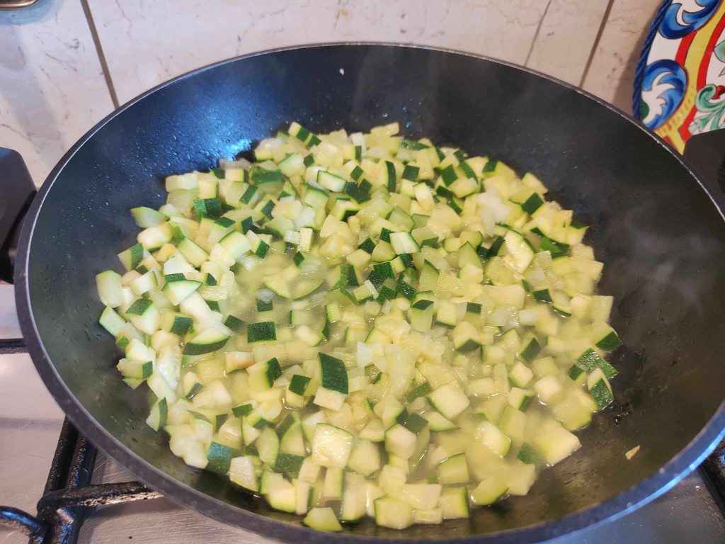 Het begint met het sauteren van de courgettes in de pan. Maak de klassieke soffritto met olie en knoflook, voeg de dun gesneden courgettes toe… En in tien minuten is het klaar!