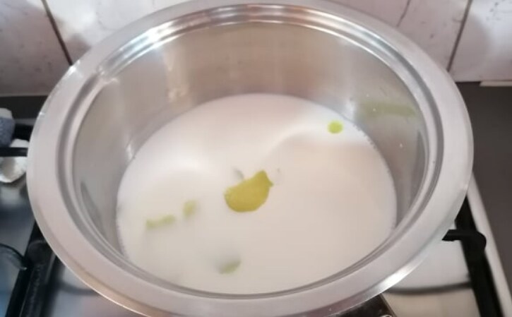 • Giet de melk in een pan en breng deze aan de kook met de hele citroenschil, zorg ervoor dat je alleen het gele deel verwijdert.