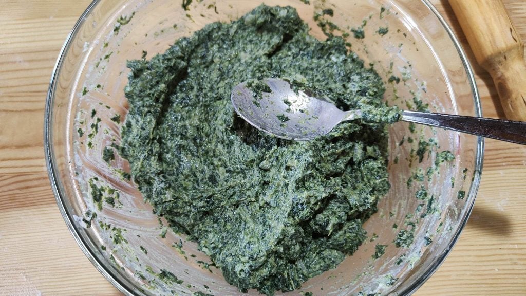 Om deze mini-taartjes te vullen, heb ik geblancheerde spinazie gebruikt en gemengd met ricotta. Alternatief kunnen ook artisjokken of gemengde kruiden gebruikt worden, heerlijk ook met brandnetel of bernagie.