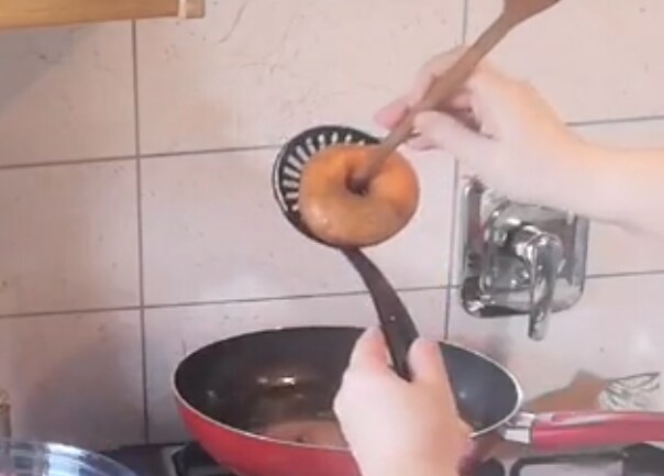 Dompel maximaal twee donuts tegelijk onder en bak ze enkele seconden aan elke kant.