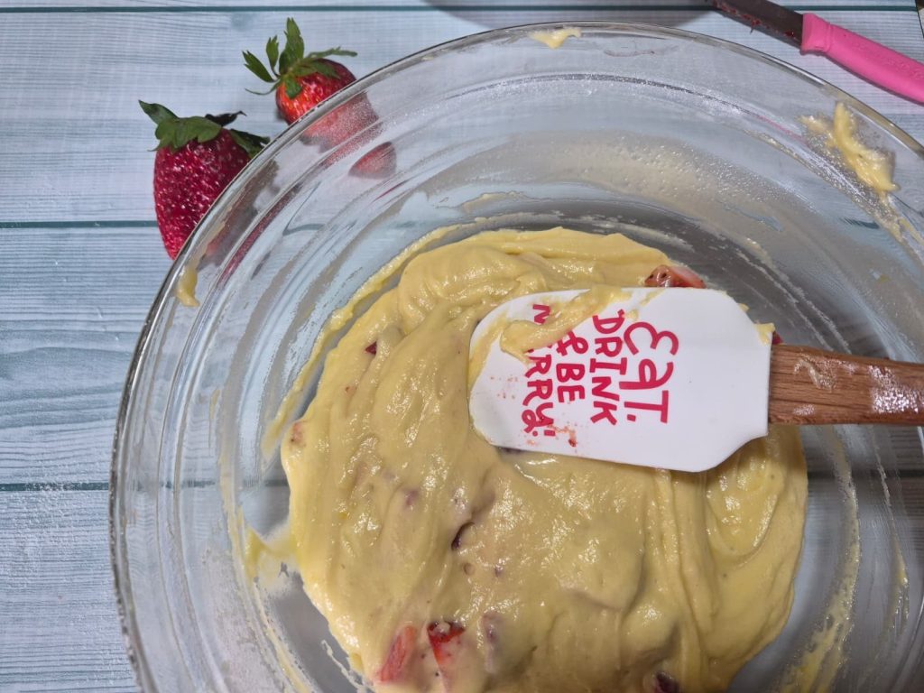 • Als je een glad beslag hebt, voeg dan voorzichtig de 200 g aardbeien in stukjes en opgedroogd toe.