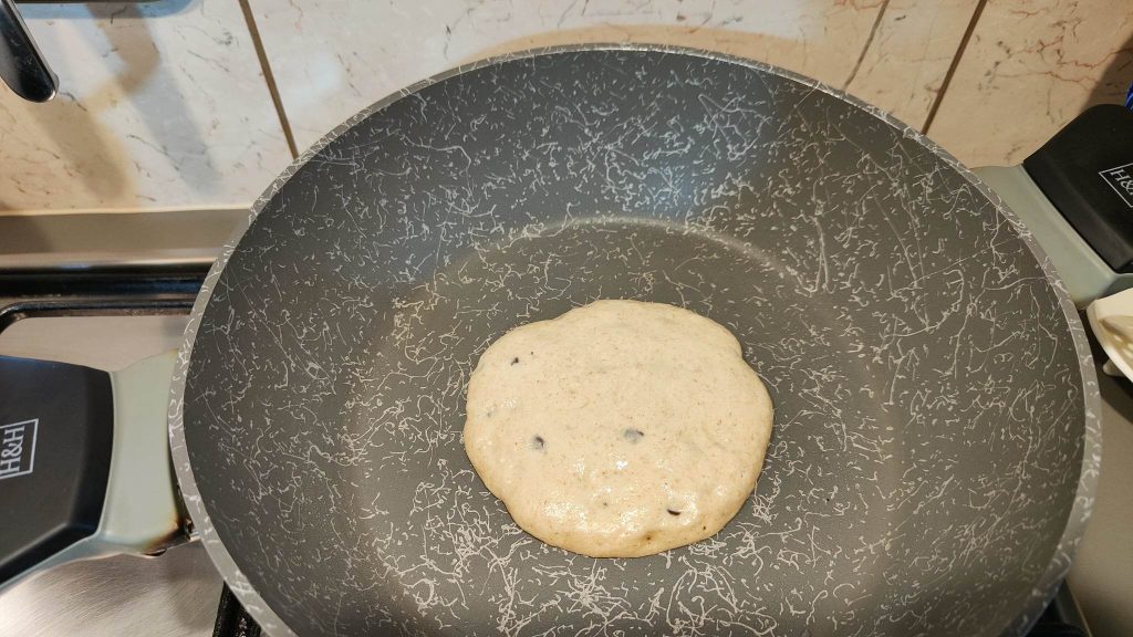 Het enige wat we nog moeten doen is onze havermoutpannenkoeken bakken in een antiaanbakpan ingevet met een beetje zonnebloemolie.