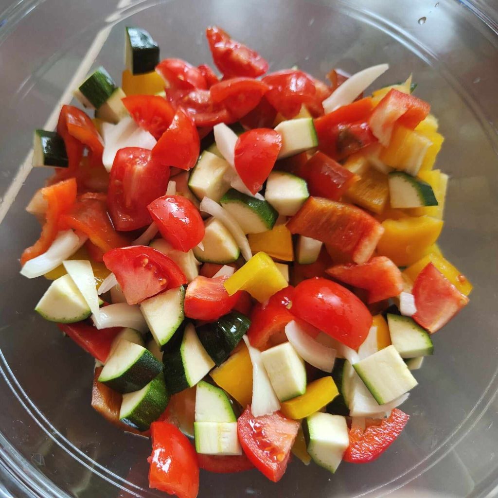 Was en maak de aubergines en courgettes schoon en maakt de paprika schoon door de pitjes en vezels te verwijderen. Daarna snijd je alle groenten in stukjes van gelijke grootte.