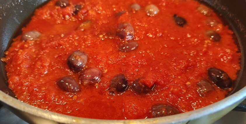 Snijd de gepelde tomaten in stukjes en voeg ze toe aan de soffritto samen met een van de twee eetlepels peterselie.