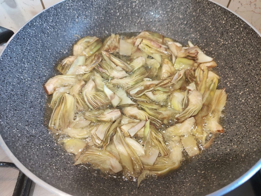 • Wanneer je klaar bent met het schoonmaken van de artisjokken, haal ze dan uit het water en voeg ze toe aan de pan nadat je de worst hebt verwijderd. Roer en voeg een beetje zout toe.